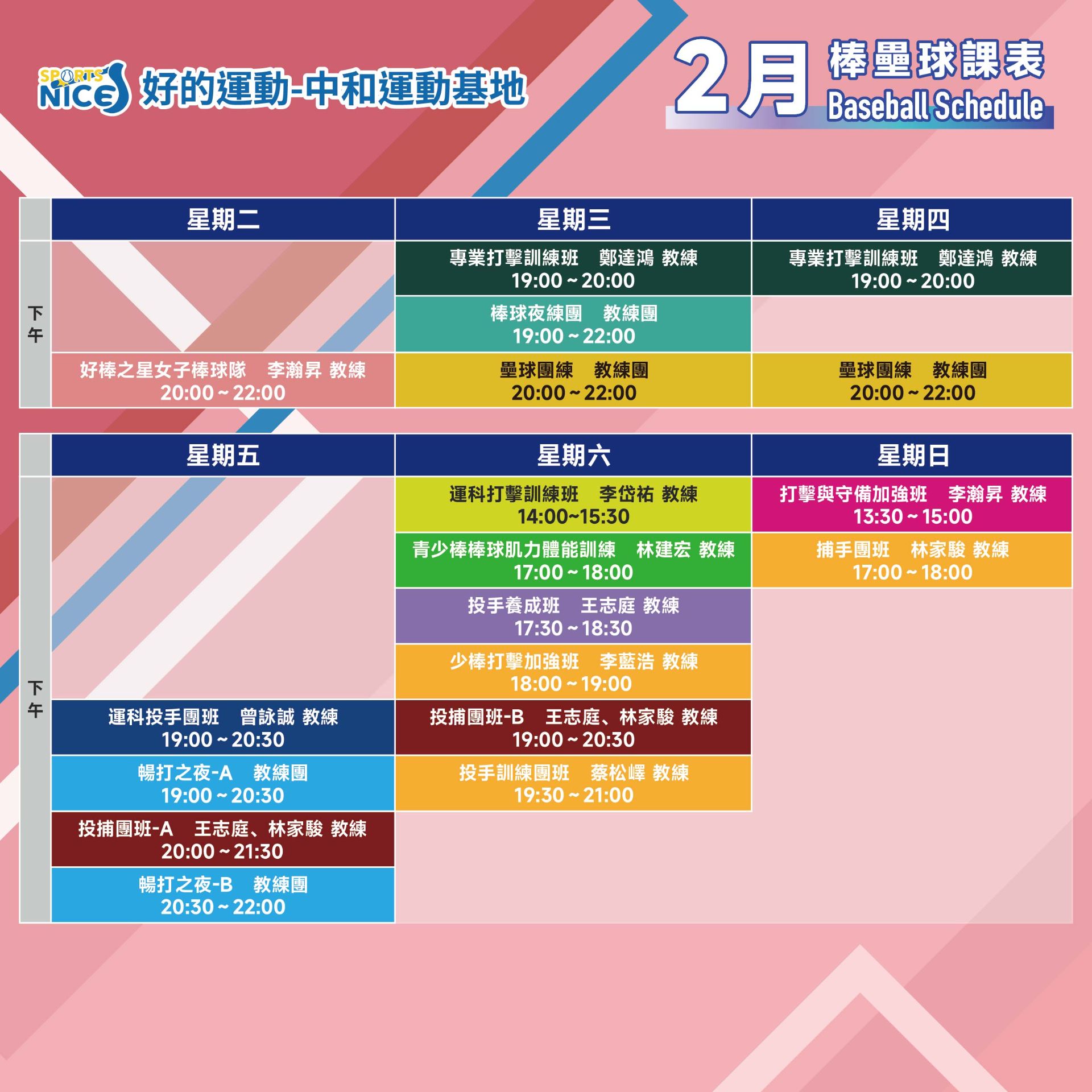 NiceSports好的運動-中和運動基地,是超過600餘坪全台灣最大棒壘球綜合性室內訓場館,專注在親子場館體驗、棒球訓練、成人壘球、運動高科技儀器分析訓練、企業活動Team building 、校園迎新與校隊協助培訓⋯等多項業務。